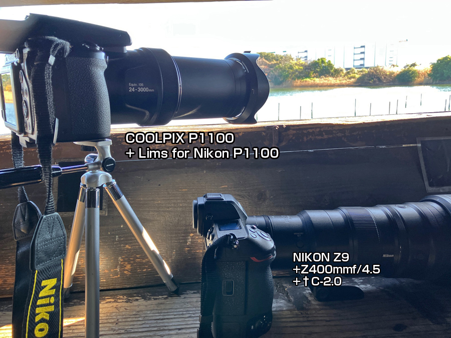 1200mm〜テレ端の撮影では、画角が約2.1°〜0.8°位です。ちょっとした事で手ブレが非常に起きやすいので、三脚固定の場合はリモートコード使用など撮影時にカメラに振れない工夫が必要です。 COOLPIX P1100の鳥モード設定メニュー COOLPIX P1100:撮影画像 トップへ ![]() COOLPIX P1100とZ9+Z400mmf/4.5VR S COOLPIX P1100 VR f/6.3 1800mm相当 ISO 250 1/500 0段