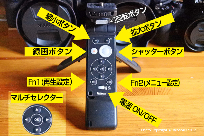 このワイヤレスリモコンのP1100への接続方法は、MENU画面の通信メニューのリモコンとの接続でできます。方法は設定後にリモコンの電源ボタンを3秒以上押すと認識されます。このリモコンからはズーミング、静止画&動画撮影が可能で、Fn1、Fn2ボタンの設定もできます。 動画の必需品:外部マイク装着のCOOLPIX P1100 トップへ