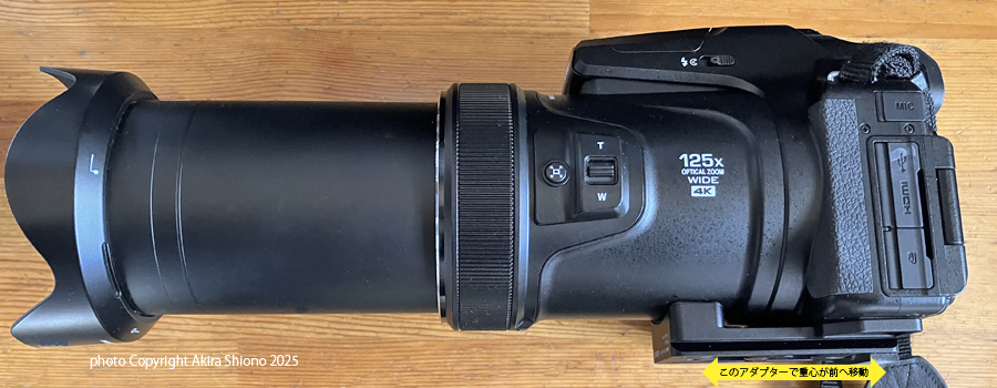 このCOOLPIX P1100の三脚ネジ穴は一般のカメラのようにボディ下にあります。実はこのCOOLPIX P1100の重心は、レンズ側のフラッシュの付け根のヒンジあたりにあります。この部分はズームレンズの下あたりなので構造上と強度的な問題から、ここには三脚のネジ穴を取り付けることができなかったと思われます。 三脚アダプター装着で三脚撮影 トップへ