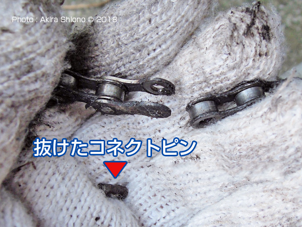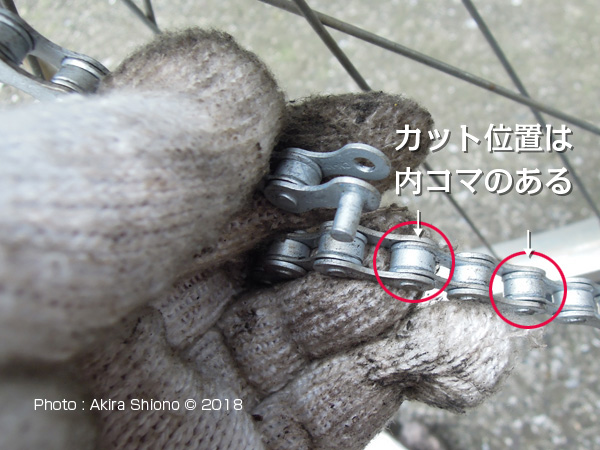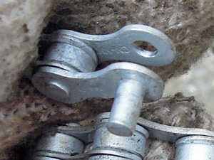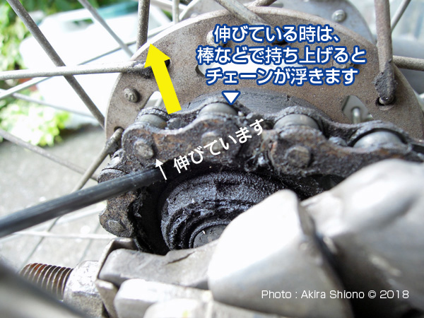 伸びたチェーンの交換:買い物自転車 トップへ 自転車のほとんどは、後輪駆動でチェーンによってベダルを踏んだ動力が後輪に伝わり車輪が回転し前進します。ベルト駆動のものもありますが、この金属製のチェーンが主流を占めています。こんな丈夫な金属で出来ているチェーンも長い間にはだんだん伸びてきます。考えて見ると急いでいる時など加速するときは、体重を掛けて「立ち漕ぎ」したり、坂道を登る時もチェーンには相当な力がかかっています。こんなことから長期間の間にはわずかづつ伸びてきます。 (写真は、棒で持ち上げてチェーンの伸びを確認しているところで、約4mmの浮きがありました) 少しくらいの伸びであれば、ペダルを漕いでいても気がつくことはありません。しかし相当伸びてくると、リアスプロケットの歯車の間の長さをチェーンのコマの長さが合わなくなり、踏むたびに「ゴリゴリ」とペダルから振動が伝わってきます。 買い物自転車1速用チェーンと多段速用チェーン トップへ