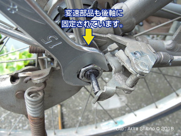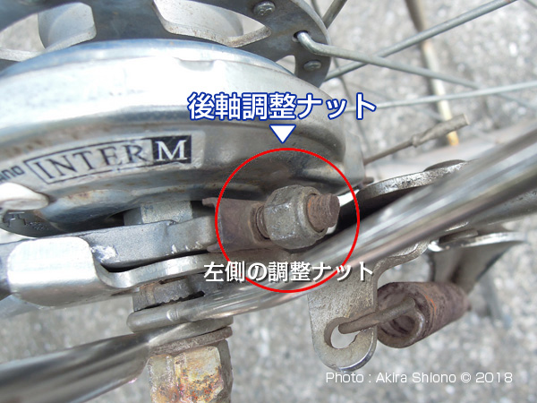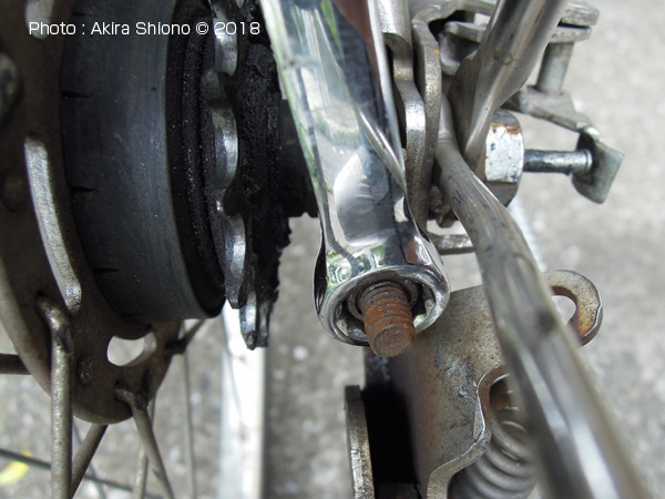 ![]() 内装変速機の場合はカバーを外しします。 右の車軸ナットを緩めます。 ![]() 調整ナットは、車軸ナットを緩めないと動きませんので、最初にこちらを緩めます。