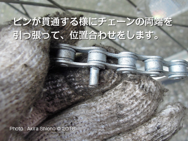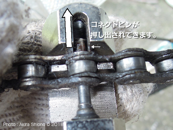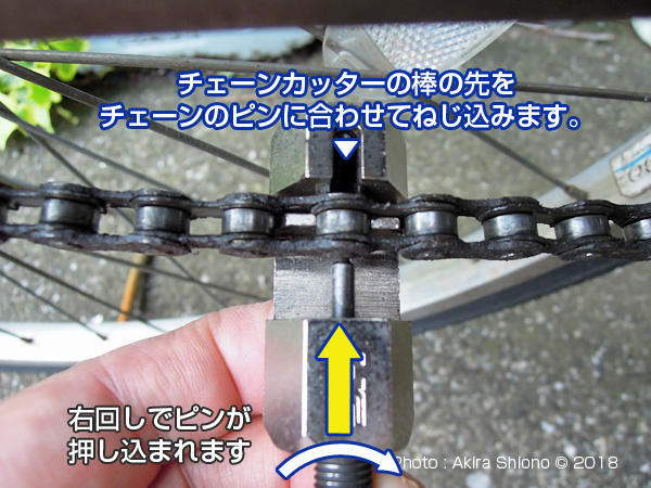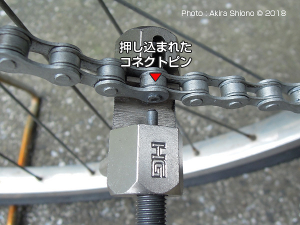 ![]() カットしたチェーンの両端を合わせ、コネクトピンを押し込んでいきます。 ![]() チェーンカッターでコネクトピンを押し込みます。反対側に出たピンが、隣と同じ出っ張りで止めます。