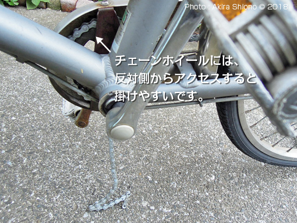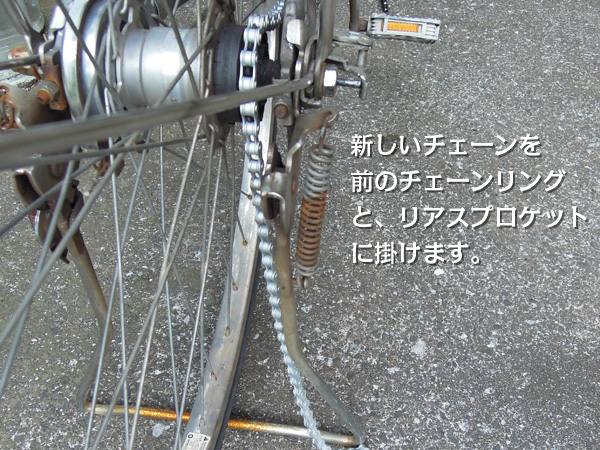 ![]() チェーンを前後のスプロケット(ギア)に掛けます。