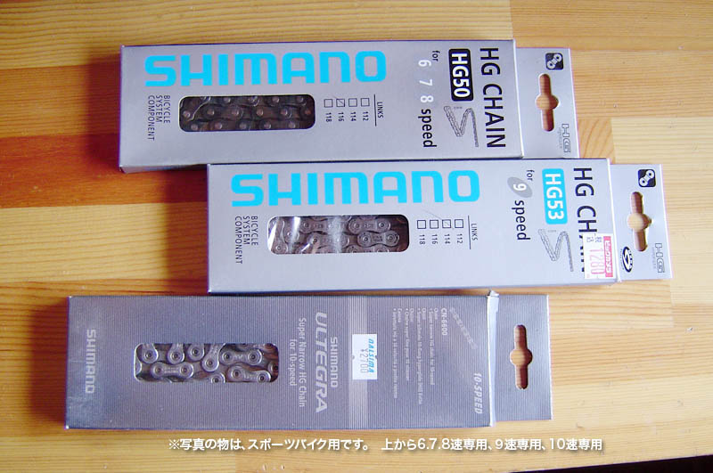 左の写真は、外装多段変速機用のチェーンです。一番上はSHIMANOの外装変速機用のチェーンで6,7,8速用でこの製品は幅広く対応しています。 修理部品と工具を見る 【入手できない方はAmazonで見れます】 【入手できない方はAmazonで見れます】