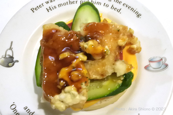 さて、メインになるタルタルチキンは、スーパーのお惣菜コーナーで販売されているタルタルチキンを使います。このチキンには「甘酢ソース」とマヨネーズがかかっているので、味のバランスが良く、レタスを載せると早く作ることができます。 下準備:バンズを温める トップへ