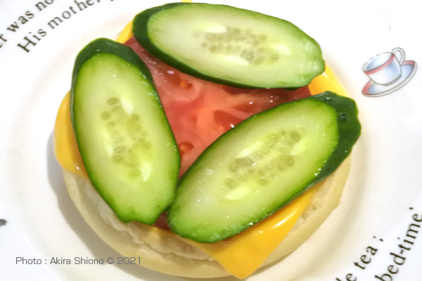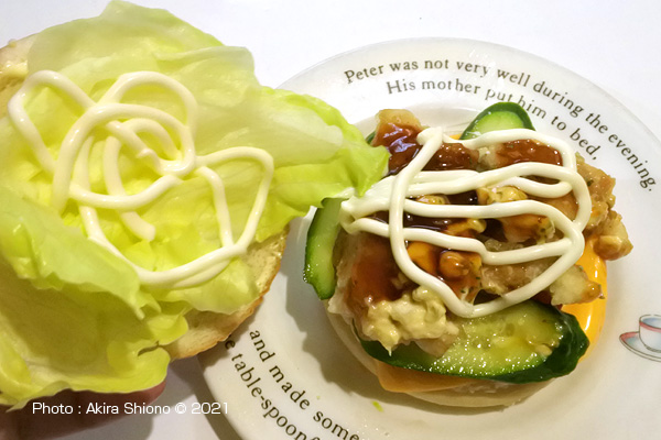 ハンバーガーバンズは、チェダーチーズを乗せて、オーブン・トースターで温めます。チーズが溶け出したらオーブン・トースターぁら取り出し、お皿に乗せます。 バンズの準備と仕上げ トップへ バンズに仕上がった材料を載せていく トップへ