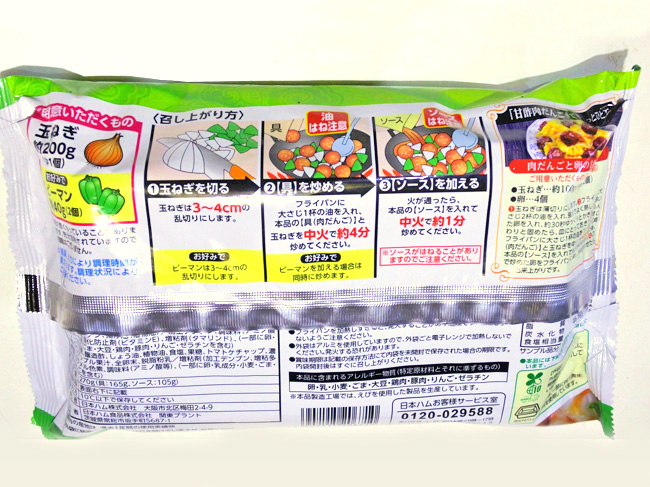 次に付属の「具」を炒めます。「具」中にはメインの肉だんごが入っています。この肉だんごについて残念なのは、長期保存のために、真空パックに入っています。こんなことから押しつぶされているのですが、パッケージの写真では丸かったのに・・・・炒めていても形が潰れたままで戻らなかったことです。団子というよりもまんじゅうに近い形でしょうか?見た目は大事ですね。 付属の「ソース」と炒めた野菜・肉だんごを炒める トップへ