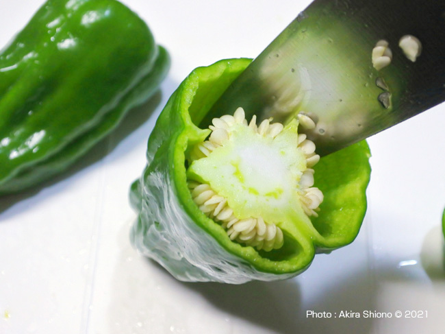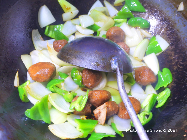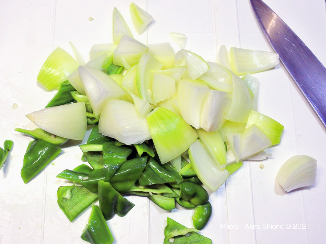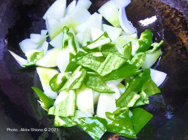 パッケージにあるように、「玉ねぎがあればすぐできる!」とありますが、料理の色合いピーマンは必要で風味がさらに増します。 野菜を炒める トップへ