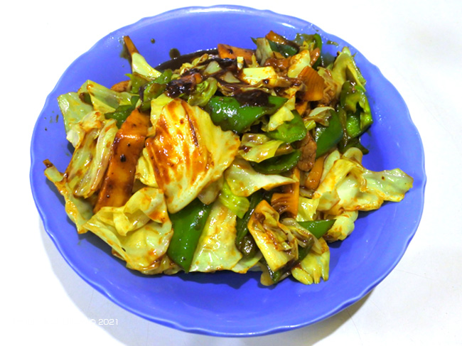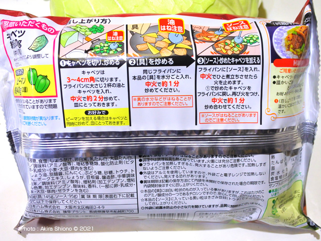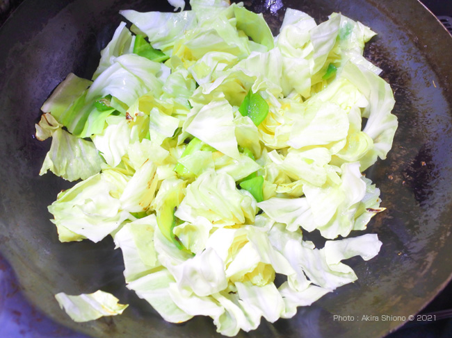 パッケージにあるように、「キャベツがあればすぐできる!」とありますが、ピーマンは必要と思います。また、長ネギもあるとさらに風味が増します。 野菜を炒める トップへ