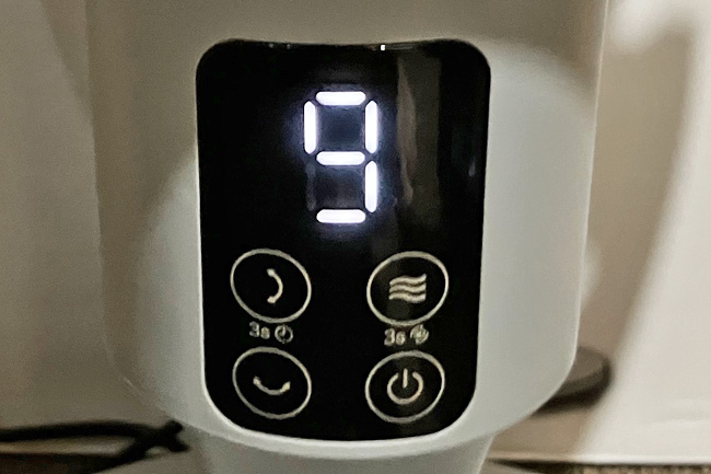 このサーキュレーターの操作パネルは、延長パイプを使用して高さを変えられる構造なので台座には無く、サーキュレーター(ブレード)部の下にあります。風量表示部の下に4つのスイッチがありますが、上の2つは長押しで複数の操作が可能となっています。上下アイコンは3秒の長押しでタイマー、右は風量ボタンで、3秒の長押しで3D首振りとなります。