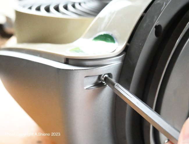 前回イオンの発生源と構造を確かめようと分解にチャレンジしましたが、なぜだかそこのプレートがはすれません。その為分解途中で内部の部品がズレて、、元に戻らないまま組み立ててしまい。結局首振りをすると異音はさらに大きくなってしまいました。結局首振り無しで使用していました。