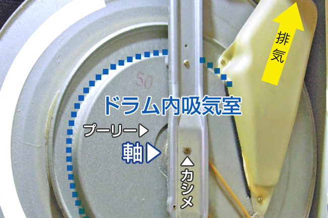 ガス衣類乾燥機の主要部は、燃焼部、ドラムの駆動部、ドラム、排気経路、