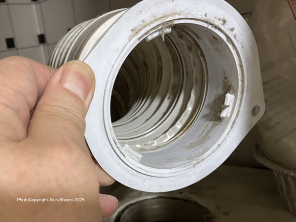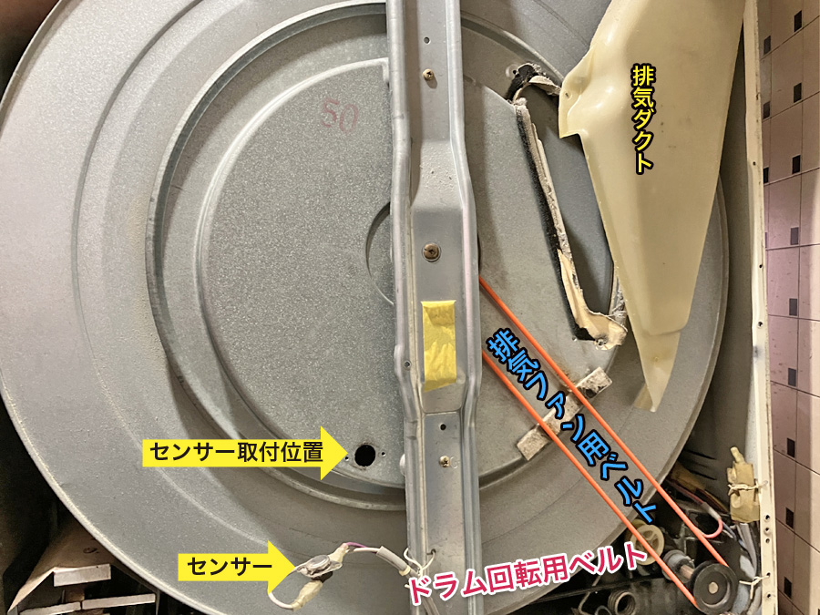 停止した衣類乾燥機のドアを開けてドラム内の温度を確認するとかなり高温になっていました。恐らく熱気の排気不良が考えられました。 衣類乾燥のための工程 2025.5.25 トップへ 上の画像がそうですが、大きな乾燥ドラムがあって、軸中央に丸いプレートがついています。乾燥ドラムは湿った衣類攪拌のために回転します。しかし中央部分は柱に固定されているので動きません。ここの軸に掛かっているベルトは、乾燥ドラムを回すための物ではないようです。クリーム色の排気ダクトを外してみると円形の蓋の中にはファンブレードが入っていました。・・・ということは、このベルトは乾燥室の熱気を野外に排出する為のファンブレードを回す為のものでした。外しついでに内部を確認してみましたが、埃の堆積は殆どありませんでした。 運転停止の原因と対策 トップへ
