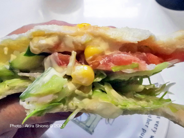 トーストし半分にスライス6枚切りの食パンを開いてマーガリン(またはバター)を塗ります。次に片面にマヨネーズを塗り芯から外した実を散らします。 ガブリ!といくとこんな断面 トップへ