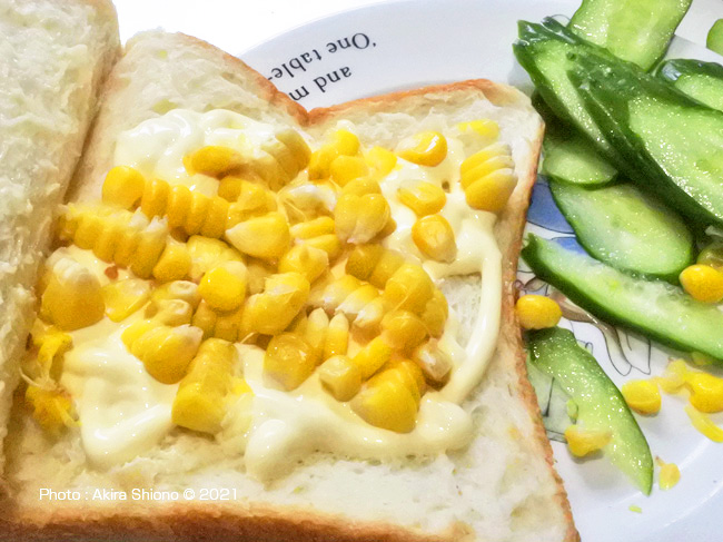 トウモロコシを茹でて、一粒づつ取り外した実を使ったコーンベジタブルサンドを作ることにします。本来はコーンマヨはオーブントースター等で焼くと風味が増して美味しいのですが、ここではフレッシュサンド仕立てにします。 【旬のコーンマヨサンドの材料 1個分】