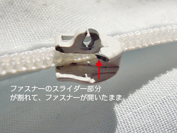 この例は、敷き布団カバーに使われているファスナーが壊れて、全開になってしまった状態です。よく見ると、スライダー部分が踏まれたのがなにかで、割れています。確認した所他には問題がなかったので、これが壊れた原因となります。 【アマゾンで工具・部品を調べる】 ※要サイズ確認!! ※部品購入時は、ナイロンか金属、サイズを選びます。No.記載が無い場合は他の衣料に使われている物に合わせるか務歯幅で選びます。 修理部品と工具を見る