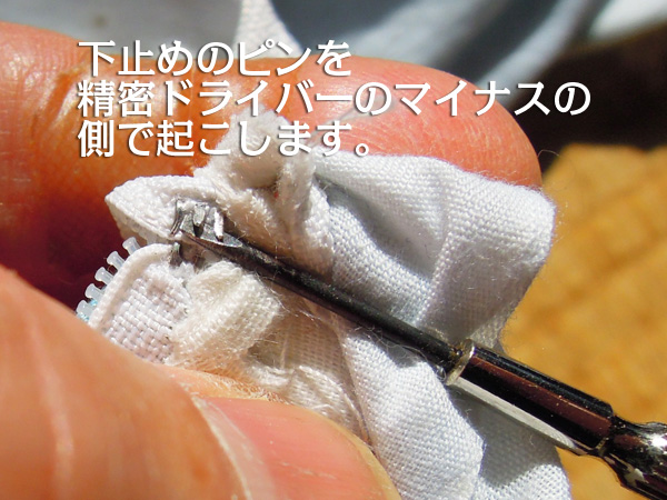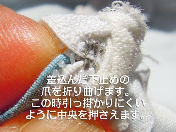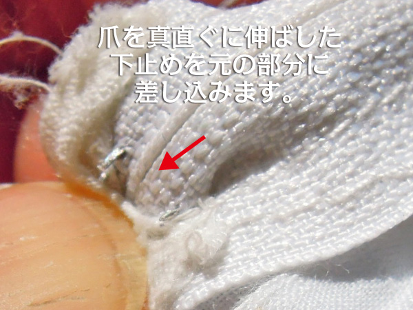 ![]() 取っておいたスライダーを下止めが付いていた部分から、まず片側をスライダーの溝に差込みます。安全のためにすこし上に移動しておきます。次に反対側のムシの入りそうな場所を確認しておきます。この位置にスライダーを戻してムシの切れ目から上に向かって差込みます。 ファスナー下止めを戻す トップへ