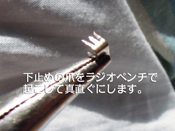 外した下止めの爪は曲がっていますので、差込みやすい様に真直ぐに伸ばしておきます。