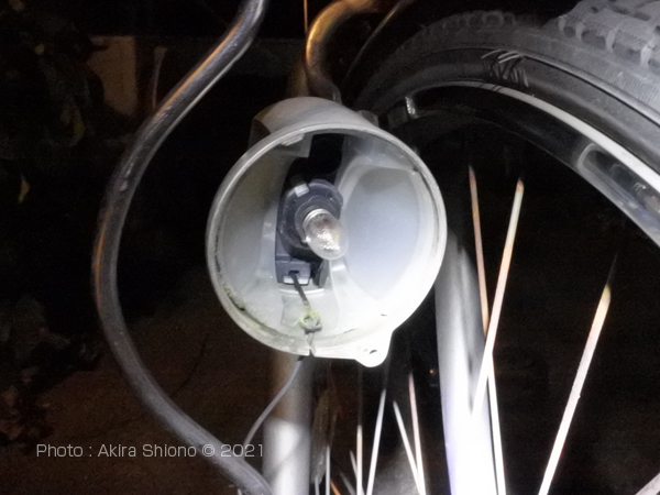 ランプに使われていた電球を調べます。まずは自転車のランプを分解して、使われている電球の形状とワット数・ボルトをを確認します。これを控えておいて同じ交換用ランプを用意します。 自転車ランプの分解