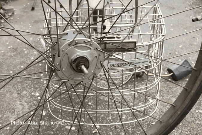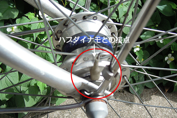 ハブダイナモが登場する前は、こんな発電時にペダルが極端に重くなる旧タイプの「リムダイナモ」かぶりきの箱に入った取り外し可能な電池式のライトでした。このような環境では夜間に走行抵抗が増える発電機を使いたくない背景が「無灯火走行」を増やしていました。こんなデメリットが多い発電機に変わって登場したのが「ハブダイナモ」です。構造はモーター軸を回転させると、モーターから電流が生まれる構造を利用したものです。発電機が車軸側にあるので、発電抵抗はリム・タイヤ接触タイプと比ペダルの負荷は殆ど感じない程度になっています。リムタイプにあった発電時に出る「シュルルル」といった音も出ませんし、ハブに内蔵されているので薄いなどのトラブルも無い様です。 スポークが錆びている場合は交換のチャンス! トップへ