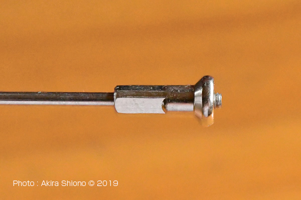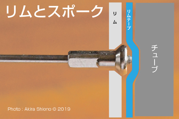 スポークにニップルをねじ込んだ状態は、左の図のようになります。スポークニップルは、車輪のリムの内側からはめ込まれています。スポークのネジピッチ部分はニップルのネジ切りの部分にねじ込まれスポークが張られています。 注意事項