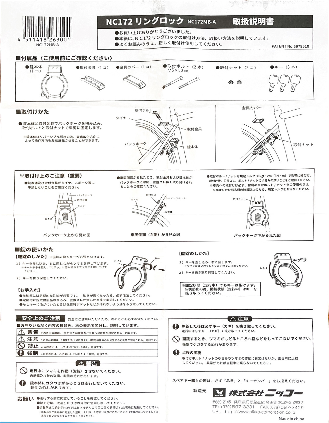 このニッコー(NIKKO) 自転車 リング錠 [NC172] リングロック V/キャリパーブレーキ対応はスポーツ車にも合う様に、できるだけ小型に設計されたリング錠です。 左側の画像が、取付説明書で、部品は6点で、リング錠本体、鍵はディンプル錠が予備を含めて3つ入っています。取付は50mmの六角ボルト(M5)が2本と、ロックナットが2個、取付金具、ゴム製の金具カバー入っています。取り付けは、8mmのメガネレンチなどの工具と六角レンチが必要です。 NC172リングタイプ錠の取付作業 トップへ