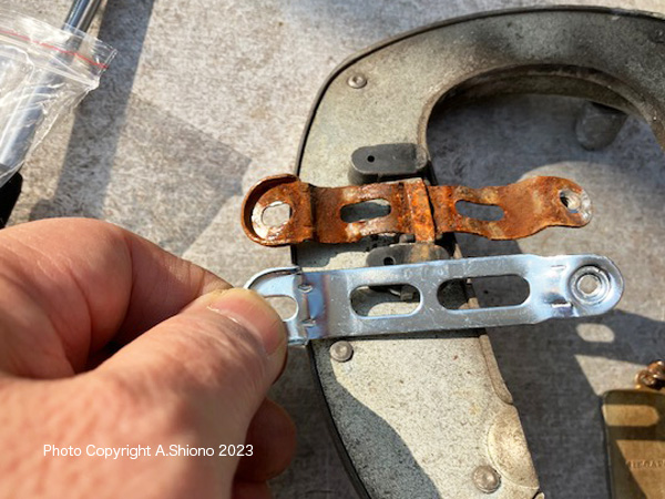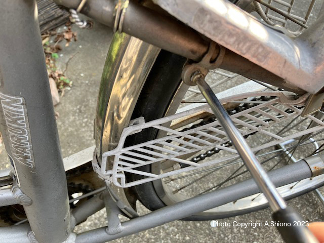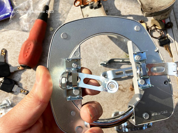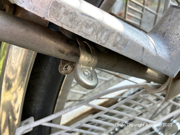 固定するバンドは移動中に落とさないように幾分曲げておきます。後ろに荷台が付いている場合、新しいリングロック錠を隙間に潜らすように差し込みます。次に表側が後ろ向くように位置を変えます。位置が大体決まったら左右の仮止めをします。 カギの状態を確認する トップへ 移 動: 経年劣化でレバーが粉砕 ハイセキュリティ・ディンプルキーに交換 カギの交換作業 新しいカギの取り付け作業 バンドを本体に通す カギの状態を確認する リンク: ロードバイク可の小型リング錠 ハンドルグリプ・変速機 リアタイヤ交換 ハンドル形状変更 リアキャリアの取付 リアスプロケット交換 サドル交換 ママチャリの不具合箇所解消!! ハブメンテ LEDライト チェーンホイール CC/BB保守 ワイヤー潤滑 ブレーキ交換 Vブレーキ交換 外装変速タイヤ交換 チェーン交換 ワイヤー交換 パンク修理 注 油 適正空気圧 リムの振れ取り スポーク修理 BBメンテ ペダルメンテ |