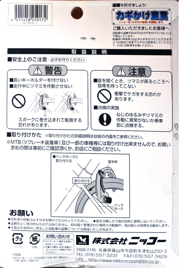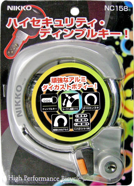 このハイセキュリティ・ディンプルキーNC158は昔のものと比べると、レバーが不用意に下がらないように、ロック機構(オレンジ色のボタン)が付いています。本体はアルミダイキャストで頑丈に作られていて、基本的に大きな変更はないようです。 自転車用サークル錠など