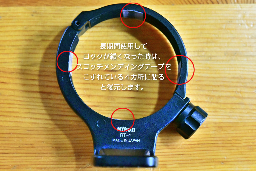 三脚台座RT-1の内側にはレンズのロックと回転防止のために、起毛した薄手のビロード状のテープが貼ってあります。長期間使用しているとレンズのロックが緩くなってきます。この原因は、優しく受け止めてくれる起毛テープの起毛部分が潰れて隙間が出来るからです。SSにテープだけの販売があるか尋ねると、内装で本体の買い替えのみとのことです。