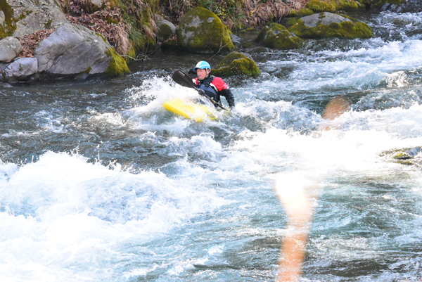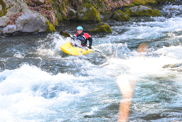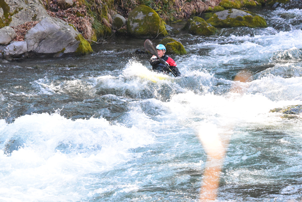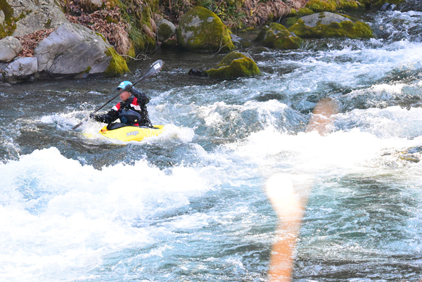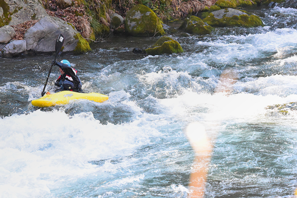 一瞬のダイブ』に写真を掲載しております。シャッター優先モードで撮影しています。D750はD800に比べて連続撮影速度・感度性能が向上しましたので、この性能を活かしました。左の写真は絞りはF10でISO感度を12800で1/1250秒で撮影しました。右の写真が絞りf6.3でISO感度を2500、1/2000秒になっています。この様に画質低下を低く抑えながら、シャッター速度や絞値を稼いでいます。 CHで6.5コマ/秒での撮影 トップへ 御岳渓谷でカヌーの練習をする人を撮ってきました。このカメラは1秒間の最高撮影コマ数が6.5コマ/秒です。手前にススキがぼけて写っていますが、カメラは固定した状態です。コマ数が8コマありますので撮影に要した時間は、1.23秒くらいになります。 ※画像をクリックすると600x401pxに拡大されます。