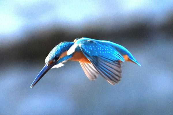 この写真はカワセミが小魚に向かって狙いを定め、ダイブする瞬間を撮影したものです。他の写真は『武蔵国分寺公園のカワセミのえさ取り