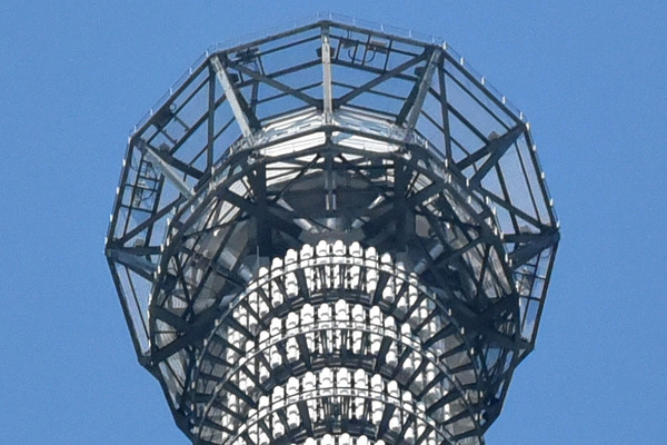 左−天望回廊(450m)を下から見た写真。赤枠内をズーム 右−さらに上のアンテナ部分を下から見た写真を赤枠内をズーム