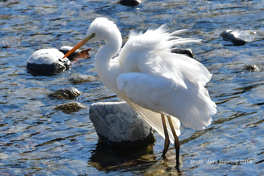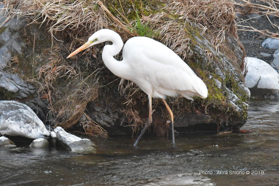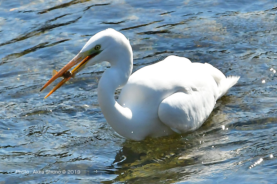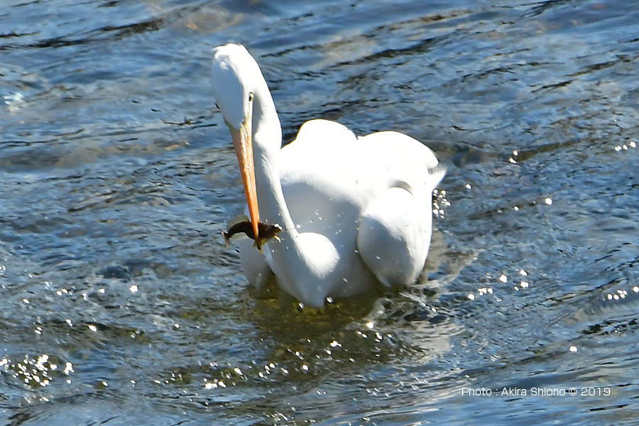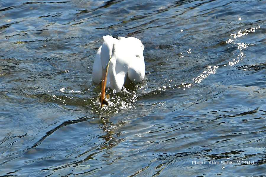 下流からでは餌を探すダイサギで胴体が着くくらいの深さで餌を採ります。