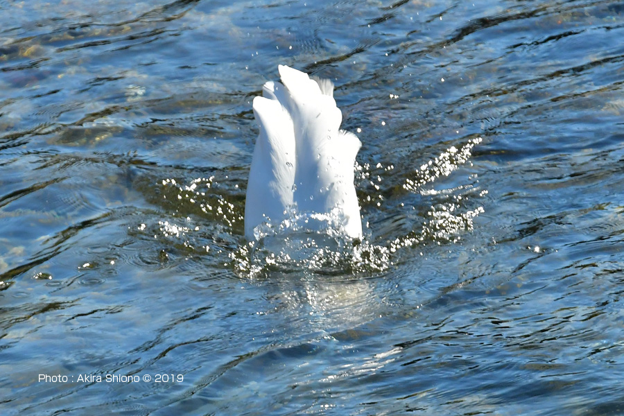 倒立する勢いで、深く首を突っ込み餌を捕まえるダイサギ。