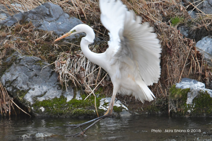 ダイサギの捕食 トップへ 飛び立つダイサギ トップへ ここは、青梅市の御岳でダイサギは体長が90cmくらいといわれています。翼端長は1.8m前後といわれています。空を飛んでいるときは、首をたたみますが飛び立ち始めから巡航飛行になるまで完全に首をたたみません。空を飛ぶ姿は優雅さを感じます。 ![]() 結局餌が見つからずに上流へ飛び立ちました。 ![]() こちらの写真は、クリックすると900x900pixに拡大してご覧になれます。 撮影:NIKON D7000+Nikkor28-300mm VR f3.5-5.6G 手持ち撮影 シラサギの小物 トップへ 移 動: 水辺の大型の野鳥 瀬で餌探し 多摩川上流部で餌探し 他のシラサギとの区別 ダイサギの捕食 飛び立つダイサギ