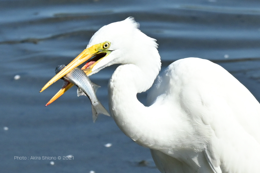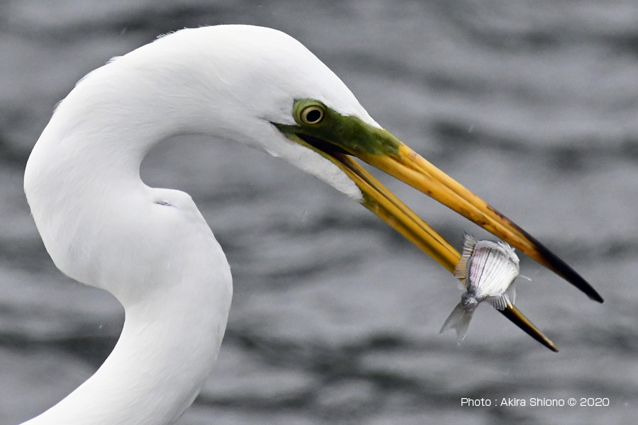 草むらの中からなにやらくわえてきたダイサギ。どうやらバッタのようです。しかし強風が吹きくわえ直した時に、風で飛ばされて地面に落ちました。風で飛んで行ってバッタの動きを追っていたダイサギは、電光石火で捕まえました。 撮影:NIKON Z50+FTZII+200-500mm;TC-14EIII 1050mm相当 集音:audio-technica AT9946CM+ウインドマフ 6月中旬:干潟で魚を狙うダイサギ トップへ ![]() 2羽でローラー作戦で魚を取るダイザギ 撮影:NIKON Z50+FTZII+TC-14EIII+NIKKOR 200-500mmVR 825mm,ISO1250,1/2000,f/14,0段 80%トリミング ![]() 透き通っている水の中の小魚めがけて一気に襲うダイサギ >撮影:NIKON Z50+FTZII+TC-14EIII+NIKKOR 200-500mmVR 825mm,ISO1250,1/2000,f/14,0段 80%トリミング 11月下旬:枯れた葦の中のダイサギ トップへ ![]() 風が吹く葦原の中でじっとするダイサギ。羽繕いでもしたのかクチバシに羽毛が付いています。 撮影NIKON Z6II+FTZ+NIKKOR 200-500mmVR 950mm,ISO4000,1/5000,f/20,-0.7段 5倍トリミング 10月下旬:ボラを捕まえたダイサギ トップへ