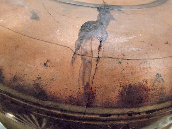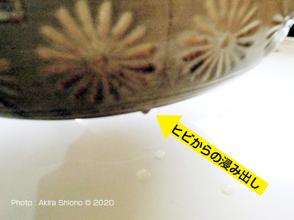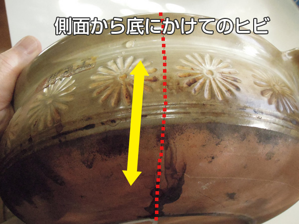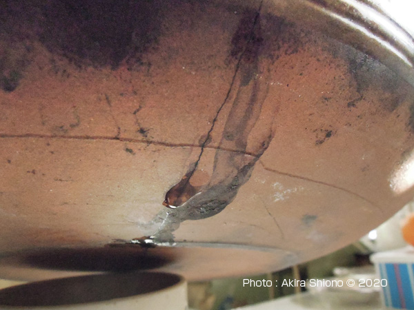 左上に見える鍋縁のヒビに何回もスプーンで液体をかけました。これで片栗粉のトロミは最大に出ているように見えます。この状態で、火を消し高温になった片栗粉を冷まして廃棄します。鍋を綺麗に掃除して漏れがなければ終了となります。 修理後の1年手前の土鍋の状態 トップへ しばらく快適に使えていた土鍋ですが、半年後位に水漏れが発生してしまいました。状況を撮影しましたのでご覧ください。 水漏れが発生!!・・・・?