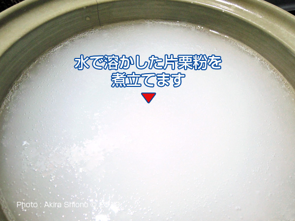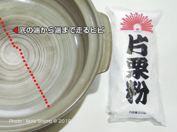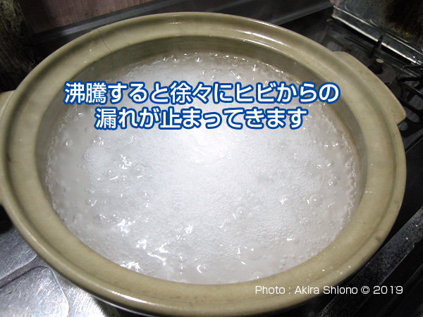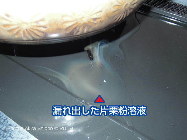 土鍋を使う前には、お米を煮てお粥状態にして、漏れ止めするようにと使用前の注意書きに書いてあります。これが一般の金属製の鍋との大きな違いです。 水漏れ修理に使う物 トップへ 水漏れ修理の作業開始 トップへ 初めは漏れ止めの片栗粉溶液は捨てることを考えて、3cm位の深さと思っていましたが、ヒビが思ったよりしっかりはいっていました。このため、鍋縁より2.5cm下まで水を入れました。ヒビ自体は一番上の縁までしっかり入っていたので、水位を補う為にスプーンで透明になり出した液体を何回もかけることにしました。 沸き出した片栗粉湯 トップへ 片栗粉は煮る時に、固まり易くまた焦げ易くなりますので、粘度がでるまでしっかりホイッパーなどでかき混ぜます。右上の写真は、小さな泡が所々から出始めました。トロミもで出したようです。火にかけて暫くしてガステーブルの天板を見ると左の写真のようにかなりの量が漏れ出していました。何回か拭き取ることをして、液体が粘度を増してくると漏れが止まり出しました。写真の漏れ出た液体はとろみが出てきているのが見えます。