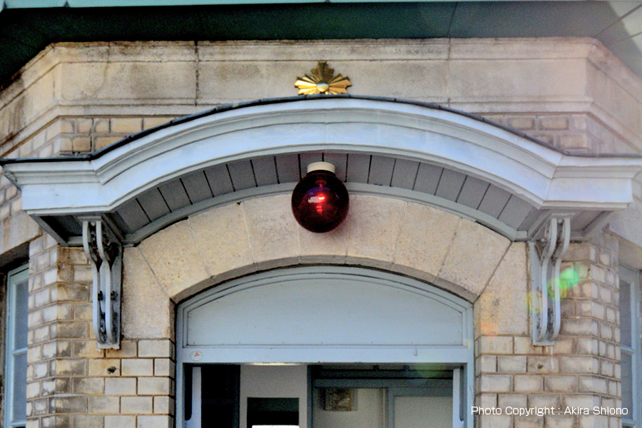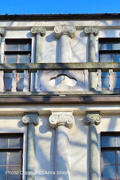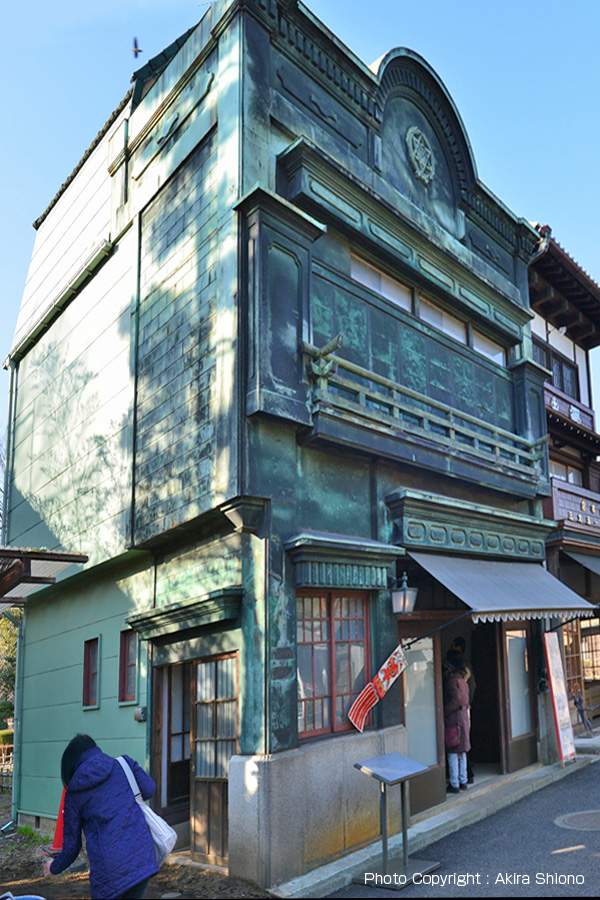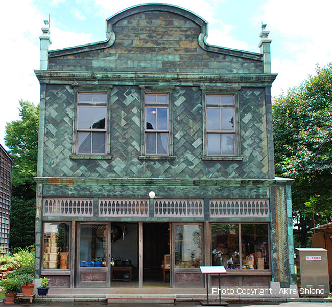 特徴的な丸二商店の表の壁の造作で、モザイク模様になった緑青が独特の雰囲気を醸し出しています。