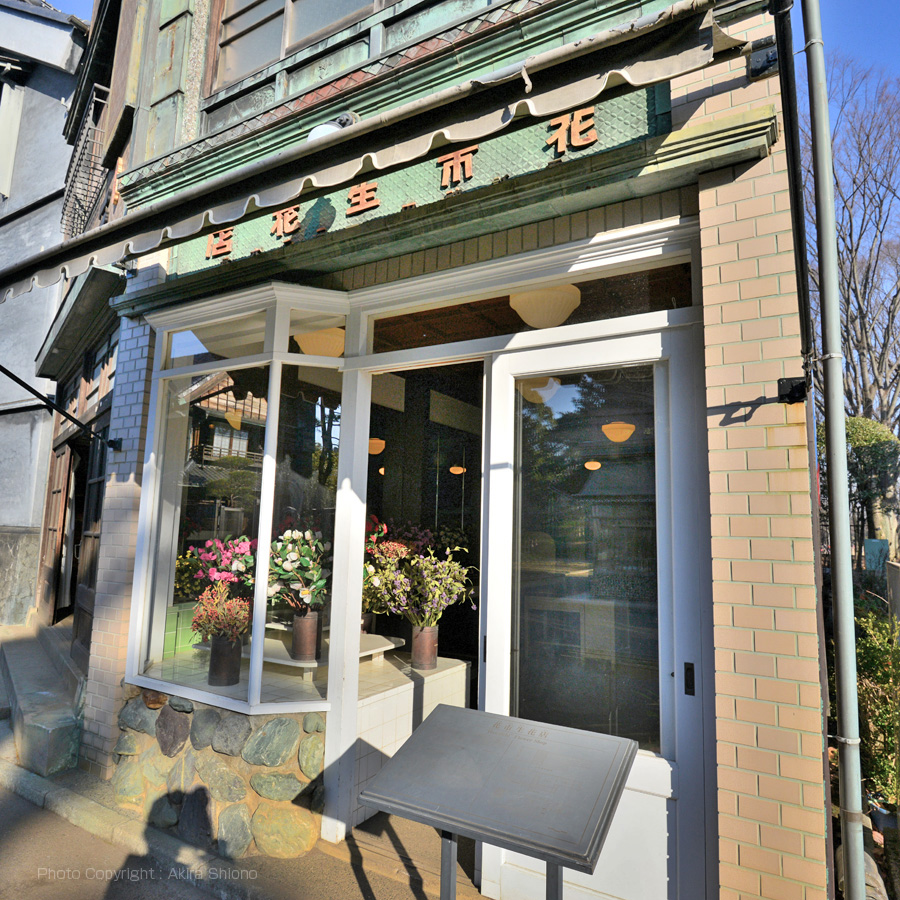 【武居三省堂(文具店)】三省堂(左)は昭和初期に創業した文具店です。当時は書道用品の卸をしていましたが、後に小売店に変わりました。建物は震災後に建てられた(看板建築)で前面がタイル貼りになっていて屋根の形にも特徴があります。 〔千代田区神田須田町一丁目/1927年(昭和2)〕 【花市生花店】 昭和初期に建てられた(看板建築の)花屋です。建物の前面には