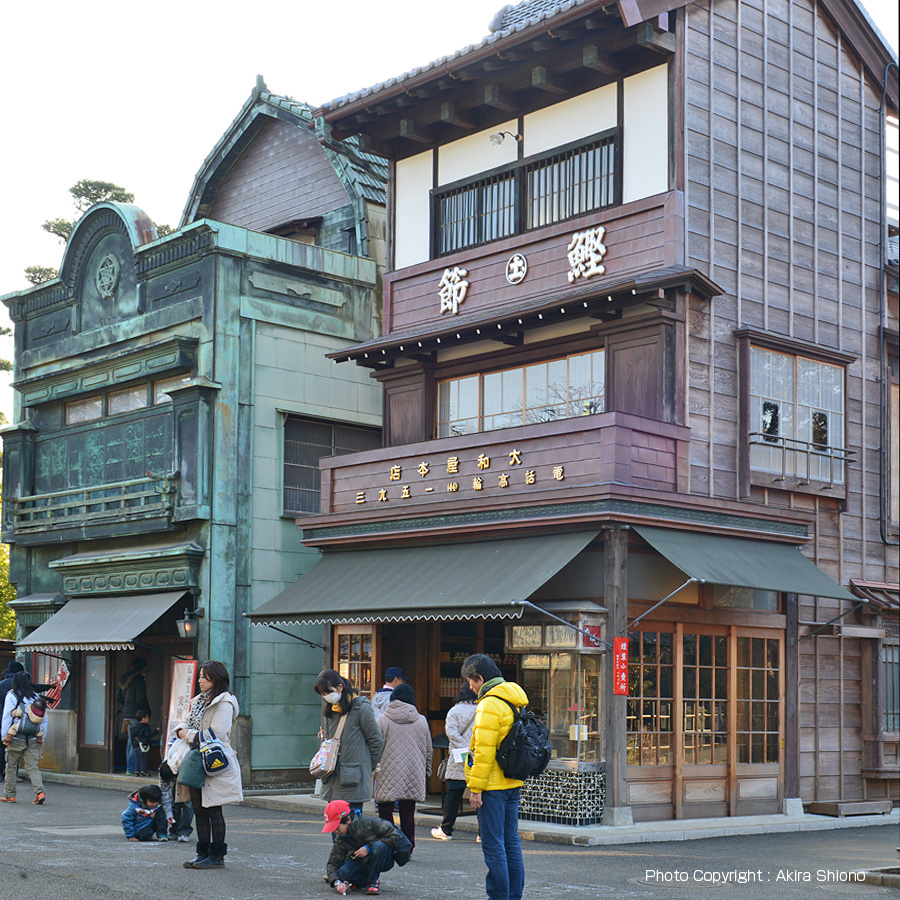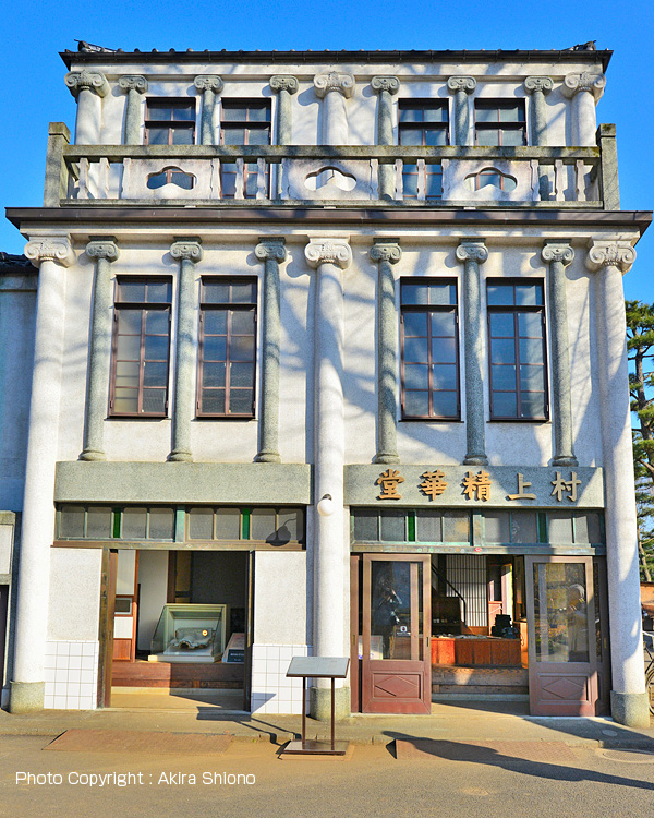 【植村邸】左の建物の前面を銅板で覆ったその姿は、(看板建築)の特徴を良く現しています。外観は、全体的に洋風にまとまっていますが、2階部分は和風のつくりとなっています。 〔中央区新富町二丁目/1927年(昭和2)〕 【大和屋本店(乾物屋)】 右の建物は、港区白金台にい1928年(昭和3)に建てられた木造3階建ての商店です。3回の軒下を伝統的な出桁造りにする一方、間口に対して背が非常に高く、看板建築のようなプロポーションを持ったユニークな建物です。戦前の乾物屋の様子を再現しています。 〔港区白金台四丁目/1928年(昭和3)〕 イオニア式の柱の村上精華堂 ▲top 台東区池之端の不忍通りに面して建っていた小間物屋(化粧品屋)です。昭和前期には、化粧用のクリーム・椿油や降水などを造って、卸売りを行っていました。正面には人造石洗い出しでイオニア式の柱を持ち、当時としてはとてもモダンな造りとなっています。 〔台東区池之端二丁目/1928年(昭和3)〕