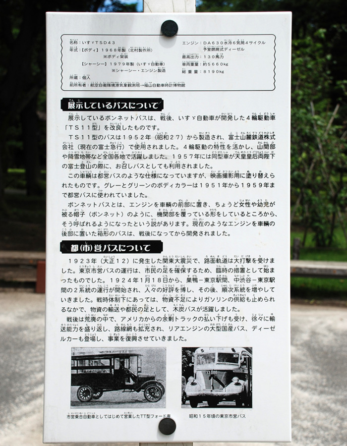 右のボンネットバスは、戦後、いすゞ自動車が開発した4輪駆動車「TS11型」を改良したものです。TS11型のバスは1952年(昭和27)から製造され、富士山麓鉄道株式会社(現在の富士急行)で使用されました。4輪駆動の特性を活かし、山間部や降雪地帯など全国各地で活躍しました。1957年には同型車が天皇皇后両陛下の富士登山の際に、お召しバスをしても利用されました。