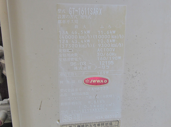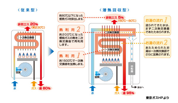 給湯器交換 エコジョーズ24号へチェンジ 移 動: 17年越えの給湯器を交換 省エネ性 新旧給湯器比較 外部リモコン リンク: エコジョース給湯器 /10年間近の点検 省エネ冷蔵庫 省エネエアコン 省エネ洗濯機 省エネ便器・便座 17年越えの給湯器を交換 トップへ 住んでいるこの家は、建築後約30年経っている家です。ガス給湯機はこれで3台目になります。交換前の給湯器は96年製と表記があり、すでに17年も過ぎていました。来年から消費税のアップや給湯器からの大きな作動音から劣化が考えられました。わずかではありますが、二酸化炭素の排出削減と省エネも考え、エコジョーズ(潜熱回収型高効率給湯器)に交換する事になりました。本来はエネファームは魅力的でしたが、高額で手が出ないために探していると、この高効率の給湯器に出会いました。従来は排気熱が230℃あった物が、50〜80℃程度までにして熱を回収するシステムです。 省エネ性 トップへ 従来の給湯器では約80%が限界だった給湯熱効率を、排気熱・潜熱回収システムにより約95%にまで向上しました。これにより省エネルギーを実現し、大幅なランニングコストの削減を実現。使用ガス量が約13%削減できるため、従来型と比較して年間で給湯だけなら約12,000円、床暖房をあわせると約16,000円の節約を可能にしています。 また、待機電力も約18年前の給湯器から約90%※削減し、省エネ設計となっています。 (東京ガスHPより)【お得な料金メニュー】 省エネ・高効率を実現した地球環境にやさしい潜熱回収型高効率給湯器 ecoジョーズ などは、従来の給湯器に比べてガスご使用量を約13%(※)カット。さらに《湯ったりエコぷらん》(要申請)でより経済的にご使用できるようです。ちなみに一般料金の料金表が適用され、年間を通じて3%(上限2,500円/月)おトクになるとのことです。 新旧給湯器比較 トップへ 左が16号で49.5kwの能力に対して、右のエコジョーズは24号で55.7kw(ともに都市ガス13A時)12.5%能力がアップしています。以前は給湯を別の箇所で使用すると片側が止まってしまっていましたが、しかし問題なく十分の湯量が出ています。2ヶ所同時給湯の場合は、8L制限のエコモードを解除する方がいいかもしれません。給湯能力は増えた物の屋内配管の径の関係で本来の能力は出せない場合があるとの事です。消費電力に関しても160w/hから110w/h(ともに50Hz時)に少なくなっています。 外部リモコン トップへ