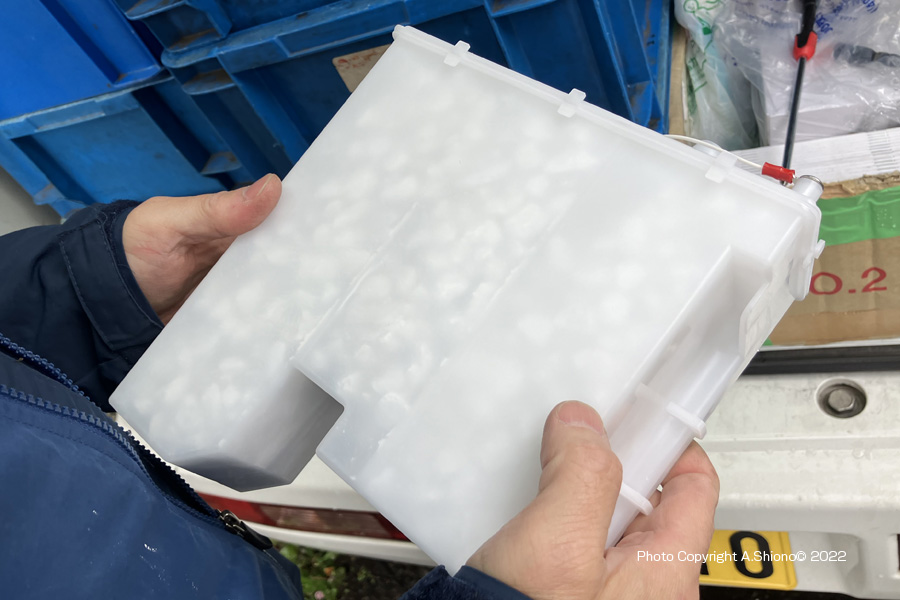 30年くらい昔のガス風呂釜のリモコンは、ワイヤー式で大きなレバーを回して室外にある風呂釜のバーナーに点火して、お風呂を炊いたり浴室から消したりしていました。しかしこの頃は浴槽に水を張ってから沸かしていました。この風呂釜が壊れると、お湯張り追い焚きができるタイプに変わりました。そのうちに省エネが叫ばれるようになってから、このエコジョーズへと変わりました。おそらく先代よりも耐久性がさらに上がっていると思われます。 点検後に交換しておいた良い部品 トップへ 本体内部の右側に中和器があります。この中和器はエコジョーズの構造上発生する、夏場の冷たい水の入ったコップにつく水滴のようなものです。これに排気ガスが混じるので、酸性化した水が発生します。これはph3程度の酸性の水です。この酸性化した水を排出するために環境に影響が無い様に中の「炭酸カルシウム」で中和する部品です。現在のフィルターは吸気した汚れで茶色っぽくなっています。この他に10年を迎える燃焼機器として交換する部品が無いそうで、恐らく次に壊れるのは燃焼部品ではなく、液晶リモコンスイッチなどの電子機器で、こうなったら全体の交換になるようです。 2箇所設置の外部リモコンは修理なし トップへ 結局かかった費用は? トップへ
