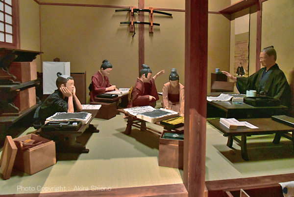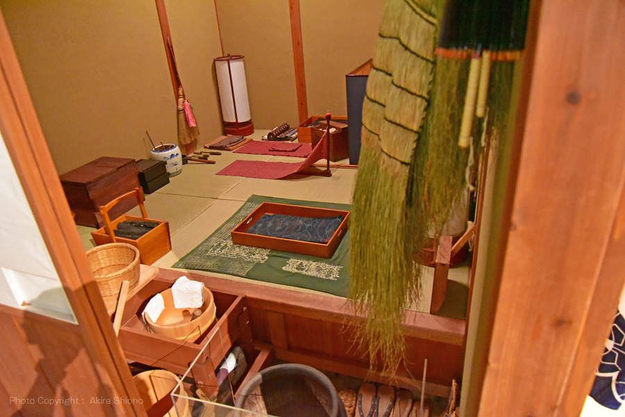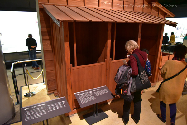 井戸・ごみ溜め・雪隠・稲荷 ここで再現されていたのは、庶民生活が表現された長屋の部屋です。寺子屋、一般の長屋の部屋、指物師の部屋、道具が並ぶ染め物師の部屋などが再現されていました。 江戸指物 指物とは、いた財を組み合わせて作る木工のことで、日本でも古くから技術が発達しているが、特に発展したのは江戸時代からである。各製品が中心で、箪笥(たんす)・机・椅子・茶棚などの大物と、硯箱(すずりばこ)・煙草盆(たばこぼん)などの小物とがあり、高級品から一般品まで技術の幅は大変広い。 指物にたずさわる職人は、指物師や指物屋と呼ばれ、居職(いじょく)が基本である。細かな行程と成功で緻密な作業を要し、道具は鑿(のみ)・錐(きり)・鉋(かんな)を中心に、種類・大きさともにさまざまある。指物は各地で発達しているが、江戸指物は簡素の中に堅牢な作りを特徴とし、伝統を引き継ぎ職人が今も細作を続けている。 (説明板より) 5F 町の暮らし/時報と消火 トップへ