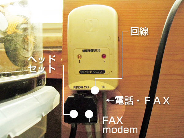現在販売されている殆どのファックスには外部回線の端子がありませんので、『2口自動転換機』を使い回線の差し込みを増設します。 しかしヘッドセットに差し込んである回線は電話に繋がっていませんので、受話できますが、発信できません。という事で発信通話はこのファックスのスピーカーホンということになります。