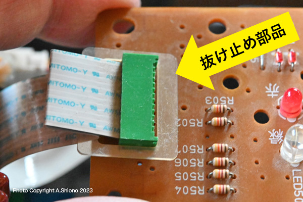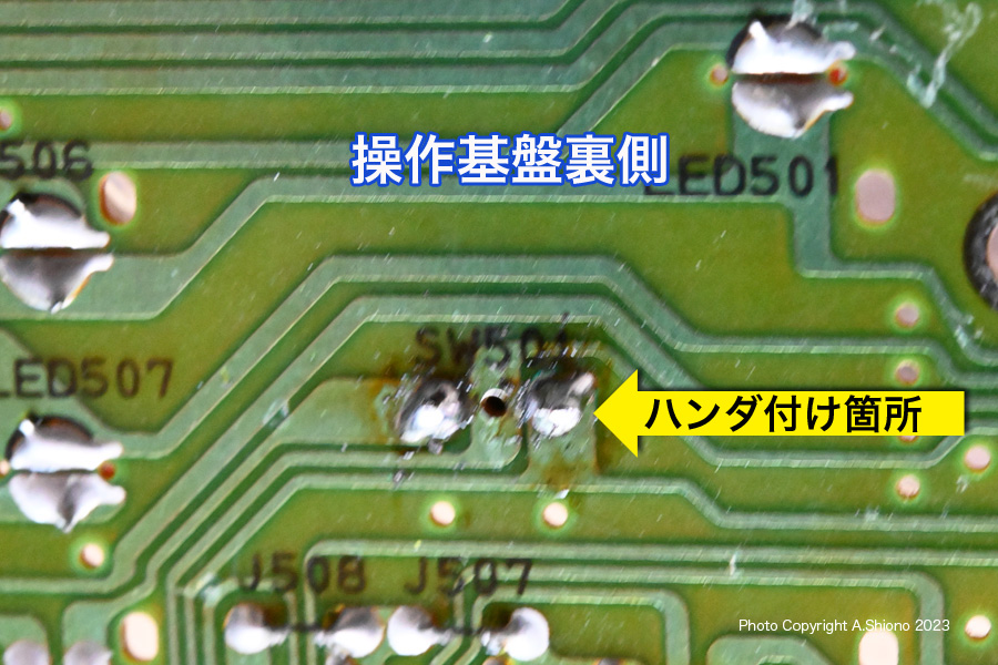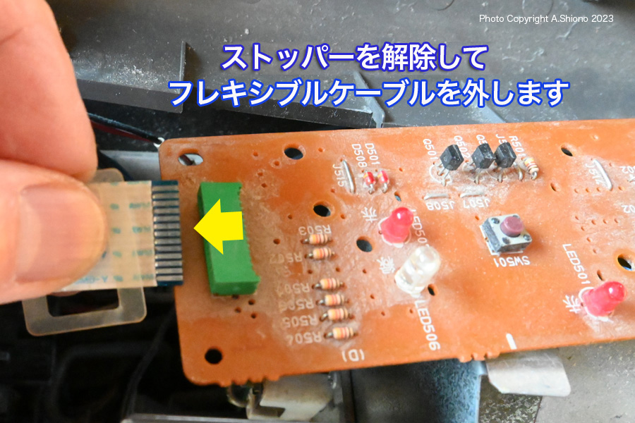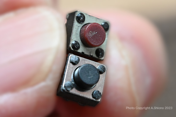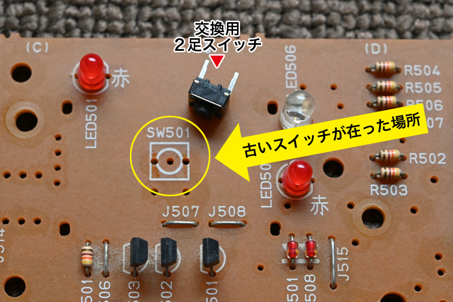 基盤からフレキシブルケーブルを外します。右は基盤の上面 ![]() 基盤のタクトスイッチは3つありますが、一番右側が「運転スイッチ」です。 古いタクトスイッチを交換する トップへ タクトスイッチ種類・置換えの工具・置き換えの注意点 トップへ ![]() 購入時はサイズ、高さ、規格を要確認です。