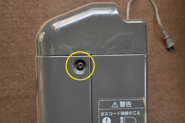 まず修理する前に、本体をからガス漏れしない様にガスの元栓を止めホースを外します。そして作業中に感電しない様にガスファンヒーターの電気コードをコンセントから外しておきます。 基盤を取り外す トップへ ![]() 取り外したスイッチパネルの裏面