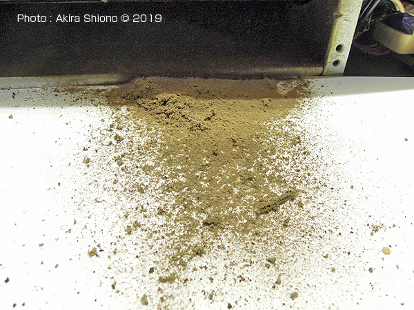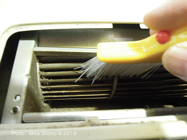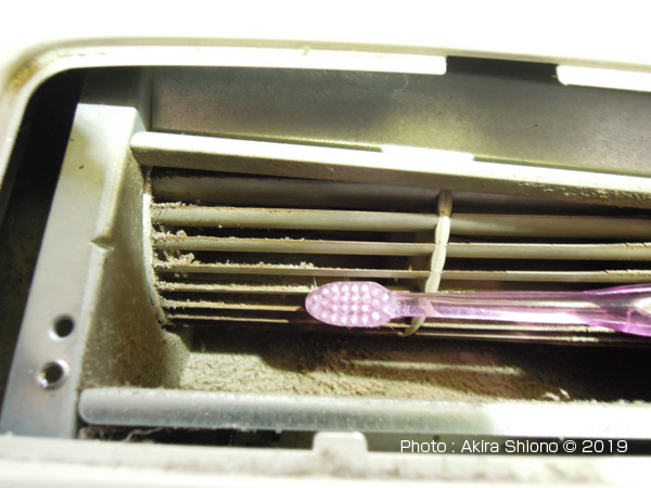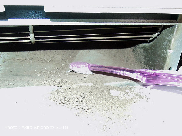 ![]() 落ちた埃を搔き出すのには、歯ブラシが奥まで入ります。かなりの量の埃。 ファン内部の残った埃を吹き出す トップへ