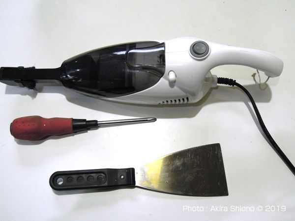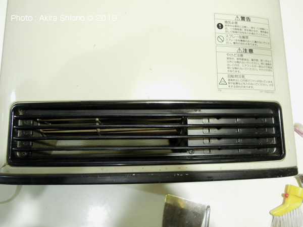 ガスファンヒーターの普段のお手入れにはフィルターのみの掃除で済みます。この製品の裏面にあるラベルには、形式番号や製造年が記載されています。このファンヒーターは2005年製造で、すでに14年も経っています。長期間使用していると内部に細かい塵がこびり付いて来ます。機種によっては構造が違いますのでご了承ください。 この場合は、燃焼した空気の排出が間に合わず、内部が高温になってしまい警告ランプが点滅してしまう場合です。 使用する用具 トップへ ガスファンヒーターの前面にあるガードを外すには、プラスドライバーのみですが、実際やったみると外す時に引っ掛かったのでスクレーパーで浮かせてあげるとすんなり外れます。 【アマゾンで用具・部品を調べる】 狭い所でも吸い取れる「小型ハンディクリーナー」と「アダプター」 【アマゾンで用具・部品を調べる】